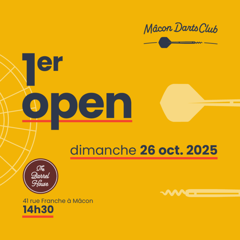 Dimanche 26 octobre 2025 à 14h30. Lieu : Barrel House (41 rue Franche à Mâcon). Inscriptions : 14h. Simple ou double : 5 € Simple + double : 8 €.