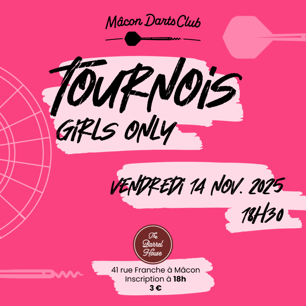 Accueil Tournois Tournois « Girls only » Tournois « Girls only »6 novembre 2025 Vendredi 14 novembre 2025 à 18h30 Barrel House : 41 rue Franche à Mâcon 3 € (inscription à 18h)